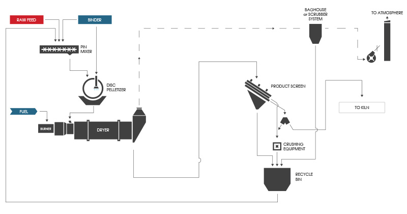 The highly refined round pellets within a narrow particle size distribution (PSD) that this process configuration yields promotes optimal heat transfer within the kiln.